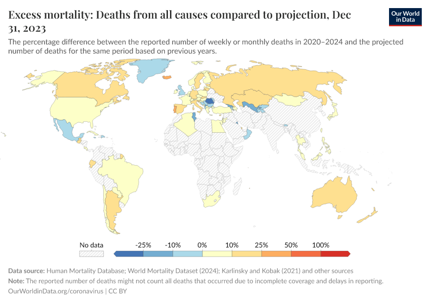 “Data Page: Excess mortality: Deaths from all causes compared to projection”. Our World in Data (2025). Data adapted from Human Mortality Database, World Mortality Database, Karlinsky & Kobak. Retrieved from https://archive.ourworldindata.org/20251208-091333/grapher/excess-mortality-p-scores-projected-baseline.html [online resource] (archived on December 8, 2025).How to cite this data