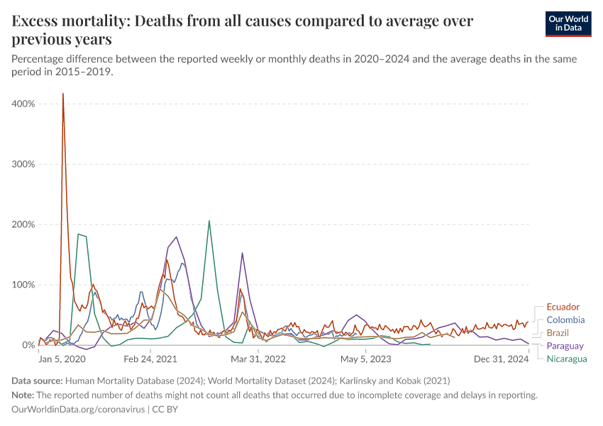 Human Mortality Database; World Mortality Dataset (2024); Karlinsky and Kobak (2021); Human Mortality Database (2025); World Mortality Database (2024) – processed by Our World in Data. “Excess mortality: Deaths from all causes compared to average over previous years” [dataset]. Human Mortality Database, “Human Mortality Database”; World Mortality Database, “World Mortality Database” [original data]. Retrieved January 15, 2026 from https://archive.ourworldindata.org/20260114-063314/grapher/excess-mortality-p-scores-average-baseline.html (archived on January 14, 2026).