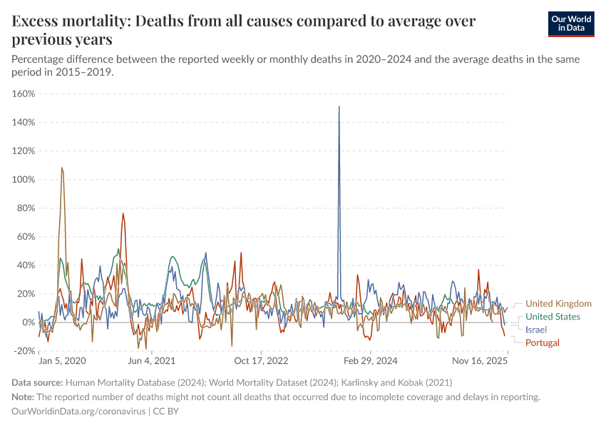 “Data Page: Excess mortality: Deaths from all causes compared to average over previous years”. Our World in Data (2025). Data adapted from Human Mortality Database, World Mortality Database. Retrieved from https://archive.ourworldindata.org/20251213-063349/grapher/excess-mortality-p-scores-average-baseline.html [online resource] (archived on December 13, 2025).How to cite this data