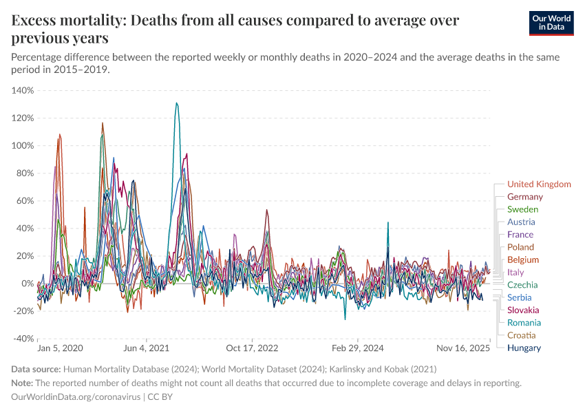 “Data Page: Excess mortality: Deaths from all causes compared to average over previous years”. Our World in Data (2025). Data adapted from Human Mortality Database, World Mortality Database. Retrieved from https://archive.ourworldindata.org/20251208-091333/grapher/excess-mortality-p-scores-average-baseline.html [online resource] (archived on December 8, 2025).How to cite this data