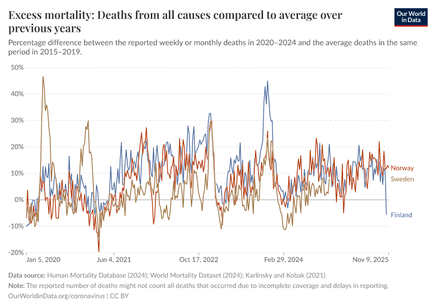 “Data Page: Excess mortality: Deaths from all causes compared to average over previous years”. Our World in Data (2025). Data adapted from Human Mortality Database, World Mortality Database. Retrieved from https://archive.ourworldindata.org/20251213-063349/grapher/excess-mortality-p-scores-average-baseline.html [online resource] (archived on December 13, 2025).How to cite this data