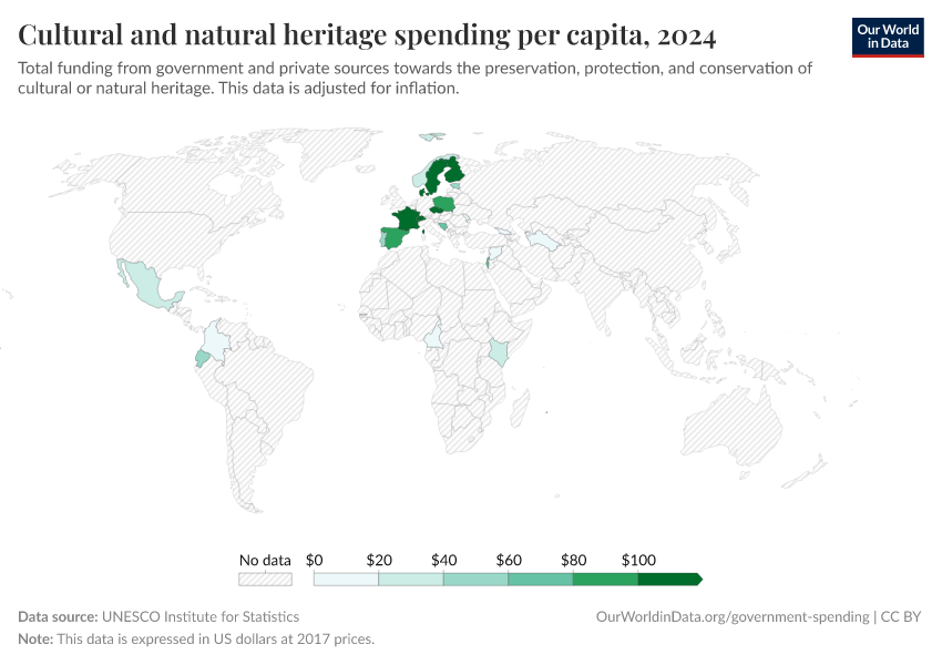 “Data Page: Cultural and natural heritage spending per capita”. Our World in Data (2025). Data adapted from UNESCO Institute for Statistics. Retrieved from https://archive.ourworldindata.org/20250909-093708/grapher/expenditure-on-cultural-and-natural-heritage-per-capita.html [online resource] (archived on September 9, 2025).How to cite this data
