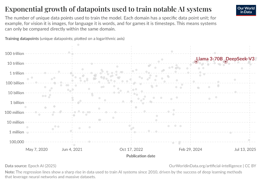 Epoch AI (2025) – with major processing by Our World in Data. “Exponential growth of datapoints used to train notable AI systems” [dataset]. Epoch AI, “Parameter, Compute and Data Trends in Machine Learning” [original data]. Retrieved December 20, 2025 from https://archive.ourworldindata.org/20251212-095432/grapher/exponential-growth-of-datapoints-used-to-train-notable-ai-systems.html (archived on December 12, 2025).