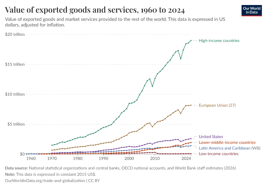 “Data Page: Value of exported goods and services”. Our World in Data (2025). Data adapted from World Bank and OECD national accounts. Retrieved from https://archive.ourworldindata.org/20251127-180431/grapher/exports-of-goods-and-services-constant-2010-us.html [online resource] (archived on November 27, 2025).How to cite this data