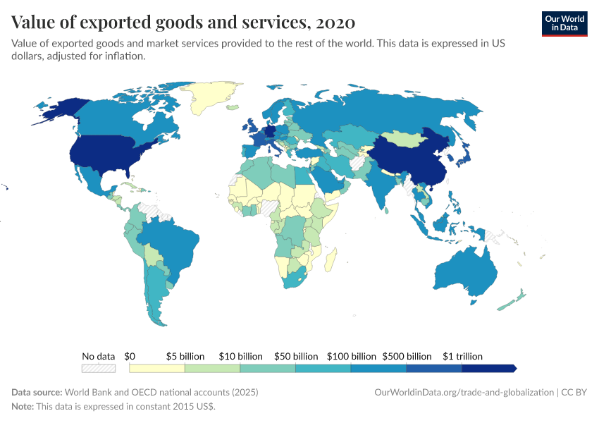 “Data Page: Value of exported goods and services”. Our World in Data (2025). Data adapted from World Bank and OECD national accounts. Retrieved from https://archive.ourworldindata.org/20251127-180431/grapher/exports-of-goods-and-services-constant-2010-us.html [online resource] (archived on November 27, 2025).How to cite this data
