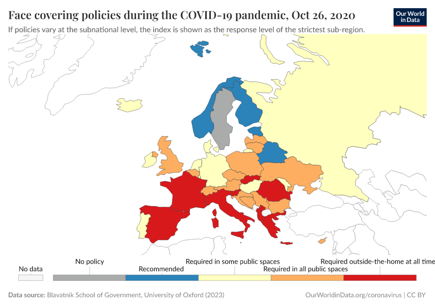 Blavatnik School of Government, University of Oxford (2023) – with minor processing by Our World in Data. “Face covering policies during the COVID-19 pandemic” [dataset]. Blavatnik School of Government, University of Oxford, “Government Response Tracker (OxCGRT)” [original data]. Retrieved December 14, 2025 from https://archive.ourworldindata.org/20250909-093708/grapher/face-covering-policies-covid.html (archived on September 9, 2025).