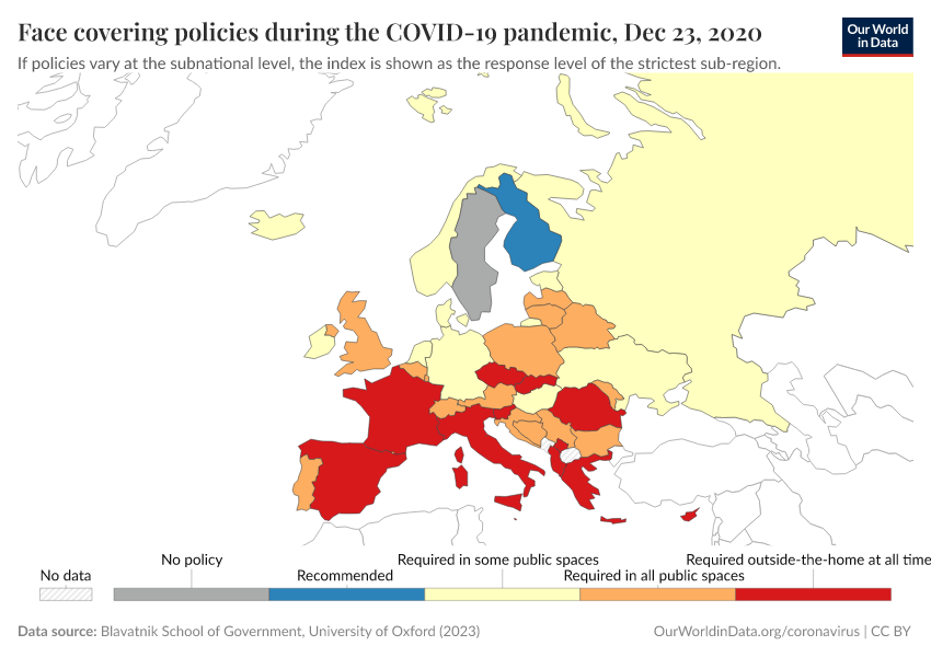 Blavatnik School of Government, University of Oxford (2023) – with minor processing by Our World in Data. “Face covering policies during the COVID-19 pandemic” [dataset]. Blavatnik School of Government, University of Oxford, “Government Response Tracker (OxCGRT)” [original data]. Retrieved December 15, 2025 from https://archive.ourworldindata.org/20250909-093708/grapher/face-covering-policies-covid.html (archived on September 9, 2025).