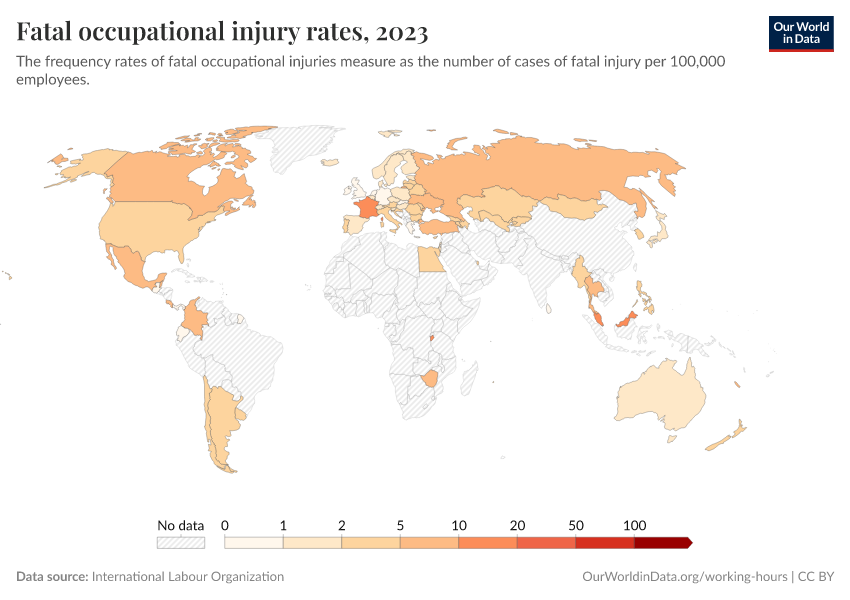 “Data Page: Fatal occupational injury rates”. Our World in Data (2025). Data adapted from International Labour Organization. Retrieved from https://archive.ourworldindata.org/20251120-211038/grapher/fatal-occupational-injuries-among-employees.html [online resource] (archived on November 20, 2025).How to cite this data