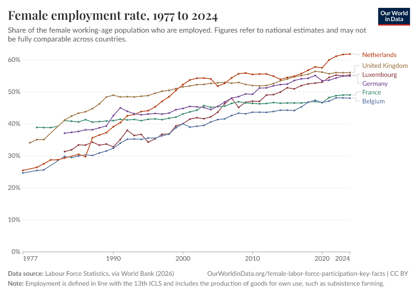 Labour Force Statistics, via World Bank (2026) – processed by Our World in Data. “Female employment rate – ILO” [dataset]. Labour Force Statistics, via World Bank, “World Development Indicators 125” [original data]. Retrieved March 2, 2026 from https://archive.ourworldindata.org/20260301-083443/grapher/female-employment-to-population-ratio.html (archived on March 1, 2026).