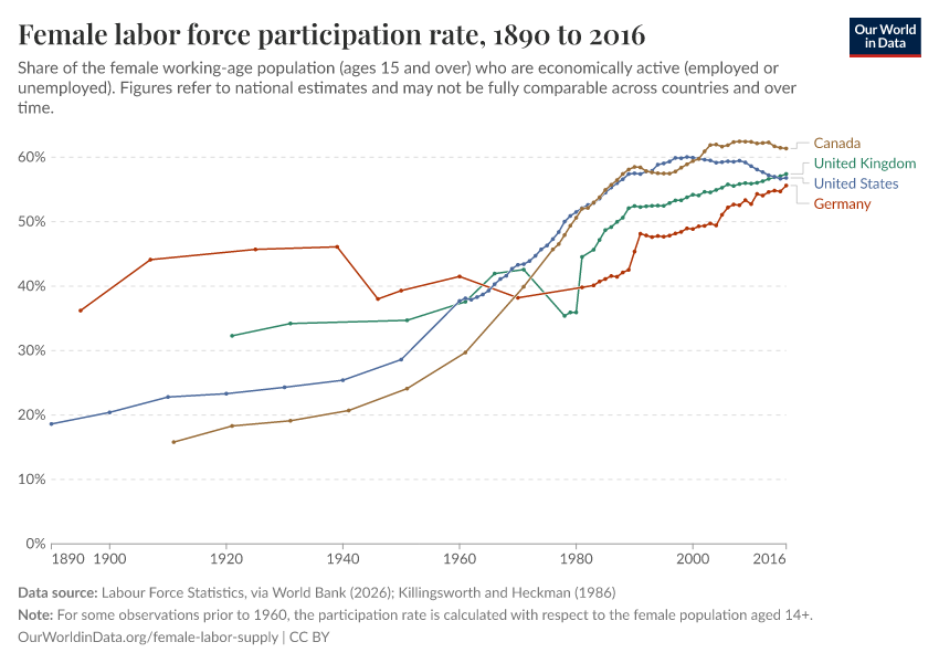 Labour Force Statistics, via World Bank (2026); Killingsworth and Heckman (1986) – with major processing by Our World in Data. “Female labor force participation rate – ILO” [dataset]. Labour Force Statistics, via World Bank, “World Development Indicators 125”; Killingsworth and Heckman, “Female labor supply: a survey” [original data]. Retrieved March 4, 2026 from https://archive.ourworldindata.org/20260304-094028/grapher/female-labor-force-participation-long-run.html (archived on March 4, 2026).