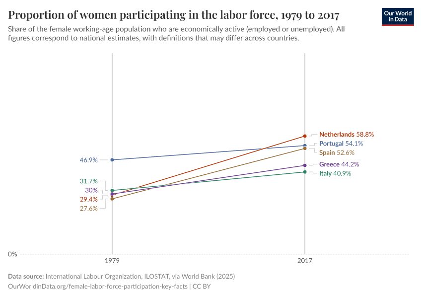 “Data Page: Proportion of women participating in the labor force”. Our World in Data (2025). Data adapted from International Labour Organization, ILOSTAT, via World Bank. Retrieved from https://archive.ourworldindata.org/20251220-152415/grapher/female-labor-force-participation-rates-slopes.html [online resource] (archived on December 20, 2025).How to cite this data