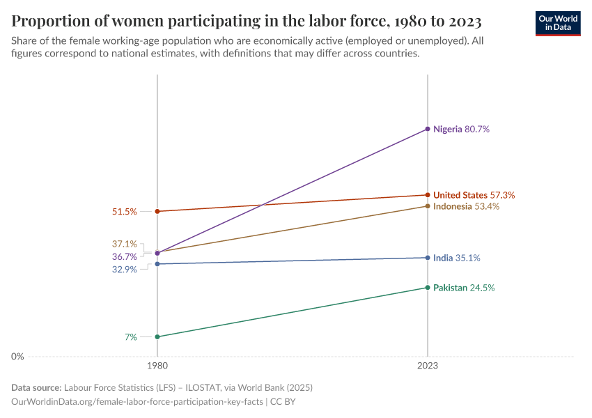 “Data Page: Proportion of women participating in the labor force”. Our World in Data (2025). Data adapted from Labour Force Statistics (LFS) – ILOSTAT, via World Bank. Retrieved from https://archive.ourworldindata.org/20251110-093020/grapher/female-labor-force-participation-rates-slopes.html [online resource] (archived on November 10, 2025).How to cite this data
