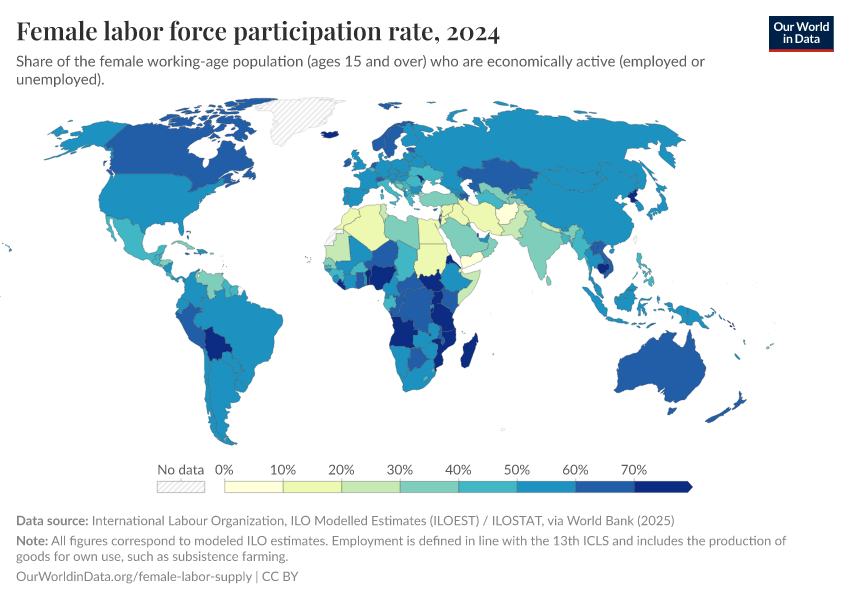 “Data Page: Female labor force participation rate”. Our World in Data (2025). Data adapted from International Labour Organization, ILO Modelled Estimates (ILOEST) / ILOSTAT, via World Bank. Retrieved from https://archive.ourworldindata.org/20251220-152415/grapher/female-labor-force-participation-rates.html [online resource] (archived on December 20, 2025).How to cite this data