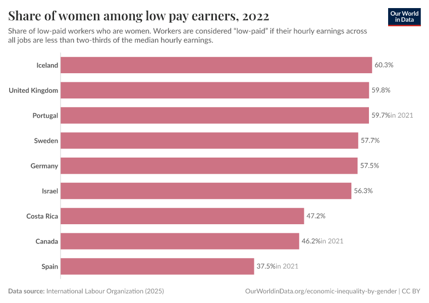 “Data Page: Share of women among low pay earners”. Our World in Data (2025). Data adapted from International Labour Organization. Retrieved from https://archive.ourworldindata.org/20251110-171402/grapher/female-share-of-low-pay-earners.html [online resource] (archived on November 10, 2025).How to cite this data