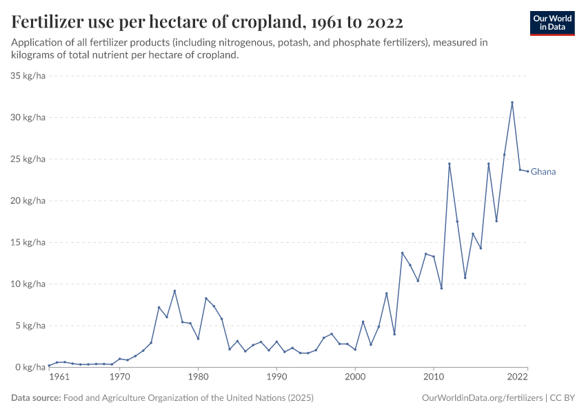 Food and Agriculture Organization of the United Nations (2025) – with major processing by Our World in Data. “Fertilizer use per hectare of cropland – FAO” [dataset]. Food and Agriculture Organization of the United Nations, “Land, Inputs and Sustainability: Fertilizers by Nutrient” [original data]. Retrieved December 6, 2025 from https://archive.ourworldindata.org/20251014-163147/grapher/fertilizer-use-per-hectare-of-cropland.html (archived on October 14, 2025).