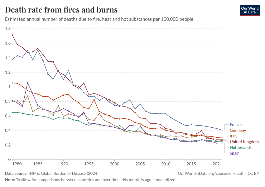 IHME, Global Burden of Disease (2024) – with minor processing by Our World in Data. “Death rate from fires and burns” [dataset]. IHME, Global Burden of Disease, “Global Burden of Disease - Deaths and DALYs” [original data]. Retrieved January 26, 2026 from https://archive.ourworldindata.org/20250909-093708/grapher/fire-death-rates.html (archived on September 9, 2025).