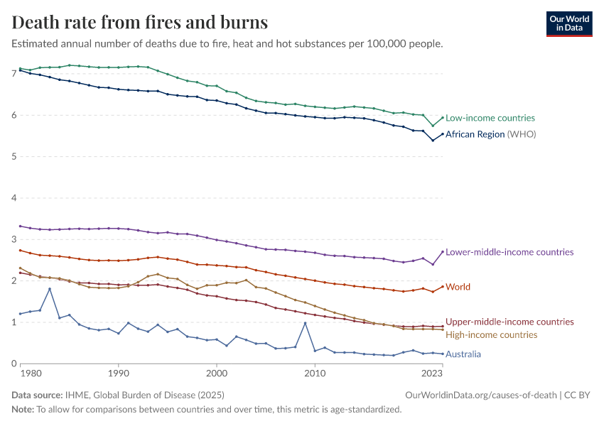 IHME, Global Burden of Disease (2025) – with major processing by Our World in Data. “Death rate from fires and burns – IHME” [dataset]. IHME, Global Burden of Disease, “Global Burden of Disease - Deaths” [original data]. Retrieved April 5, 2026 from https://archive.ourworldindata.org/20260323-161325/grapher/fire-death-rates.html (archived on March 23, 2026).