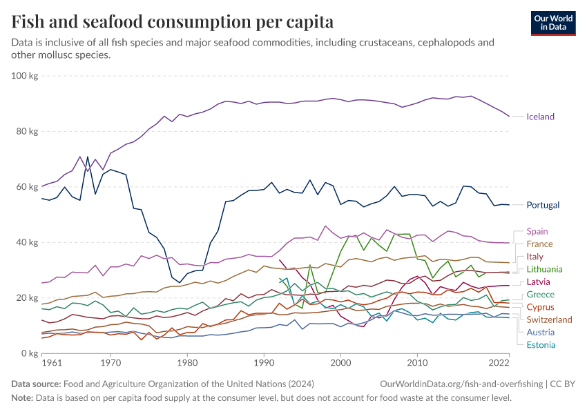 “Data Page: Yearly per capita supply of fish and seafood”. Our World in Data (2026). Data adapted from Food and Agriculture Organization of the United Nations. Retrieved from https://archive.ourworldindata.org/20260105-133053/grapher/fish-and-seafood-consumption-per-capita.html [online resource] (archived on January 5, 2026).How to cite this data