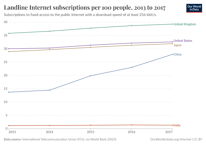 “Data Page: Landline Internet subscriptions per 100 people”. Our World in Data (2025). Data adapted from International Telecommunication Union (ITU), via World Bank. Retrieved from https://archive.ourworldindata.org/20250916-100934/grapher/broadband-penetration-by-country.html [online resource] (archived on September 16, 2025).