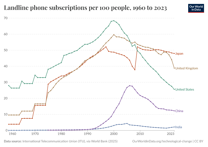 “Data Page: Landline phone subscriptions per 100 people”. Our World in Data (2025). Data adapted from International Telecommunication Union (ITU), via World Bank. Retrieved from https://archive.ourworldindata.org/20250916-102301/grapher/fixed-telephone-subscriptions-per-100-people.html [online resource] (archived on September 16, 2025).How to cite this data