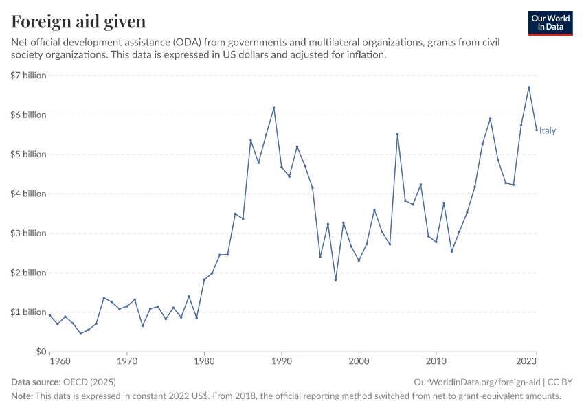 OECD (2025) – with major processing by Our World in Data. “Foreign aid given – Net disbursements” [dataset]. OECD, “OECD Official Development Assistance (ODA) - DAC1: Flows by provider (ODA+OOF+Private)”; OECD, “OECD Official Development Assistance (ODA) - DAC2A: Aid (ODA) disbursements to countries and regions” [original data]. Retrieved December 5, 2025 from https://archive.ourworldindata.org/20250909-093708/grapher/foreign-aid-given-net.html (archived on September 9, 2025).