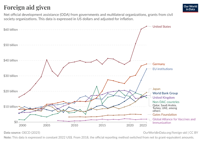 OECD (2025) – with major processing by Our World in Data. “Foreign aid given – Net disbursements” [dataset]. OECD, “OECD Official Development Assistance (ODA) - DAC1: Flows by provider (ODA+OOF+Private)”; OECD, “OECD Official Development Assistance (ODA) - DAC2A: Aid (ODA) disbursements to countries and regions” [original data]. Retrieved December 14, 2025 from https://archive.ourworldindata.org/20250909-093708/grapher/foreign-aid-given-net.html (archived on September 9, 2025).