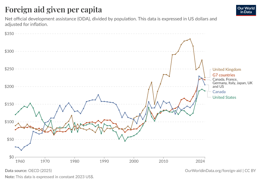 OECD (2025) – with major processing by Our World in Data. “Foreign aid given per capita – Net disbursements” [dataset]. OECD, “OECD Official Development Assistance (ODA) - DAC1: Flows by provider (ODA+OOF+Private)” [original data]. Retrieved January 11, 2026 from https://archive.ourworldindata.org/20251230-141326/grapher/foreign-aid-given-per-capita.html (archived on December 30, 2025).