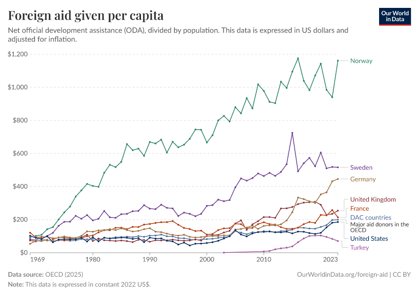 “Data Page: Foreign aid given per capita”, part of the following publication: Bastian Herre, Pablo Arriagada, Simon van Teutem, and Hannah Ritchie (2024) - “Foreign Aid”. Data adapted from OECD. Retrieved from https://archive.ourworldindata.org/20250909-093708/grapher/foreign-aid-given-per-capita.html [online resource] (archived on September 9, 2025).How to cite this data