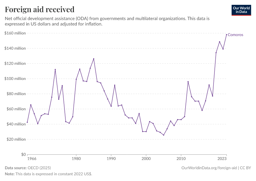 OECD (2025) – with minor processing by Our World in Data. “Foreign aid received – Official donors” [dataset]. OECD, “OECD Official Development Assistance (ODA) - DAC2A: Aid (ODA) disbursements to countries and regions” [original data]. Retrieved December 16, 2025 from https://archive.ourworldindata.org/20251209-133038/grapher/foreign-aid-received-net.html (archived on December 9, 2025).