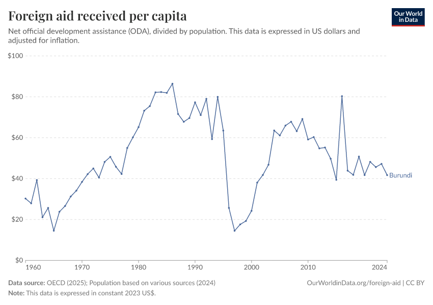 “Data Page: Foreign aid received per capita”, part of the following publication: Bastian Herre, Pablo Arriagada, Simon van Teutem, and Hannah Ritchie (2024) - “Foreign Aid”. Data adapted from OECD, Various sources. Retrieved from https://archive.ourworldindata.org/20260105-203148/grapher/foreign-aid-received-per-capita.html [online resource] (archived on January 5, 2026).How to cite this data