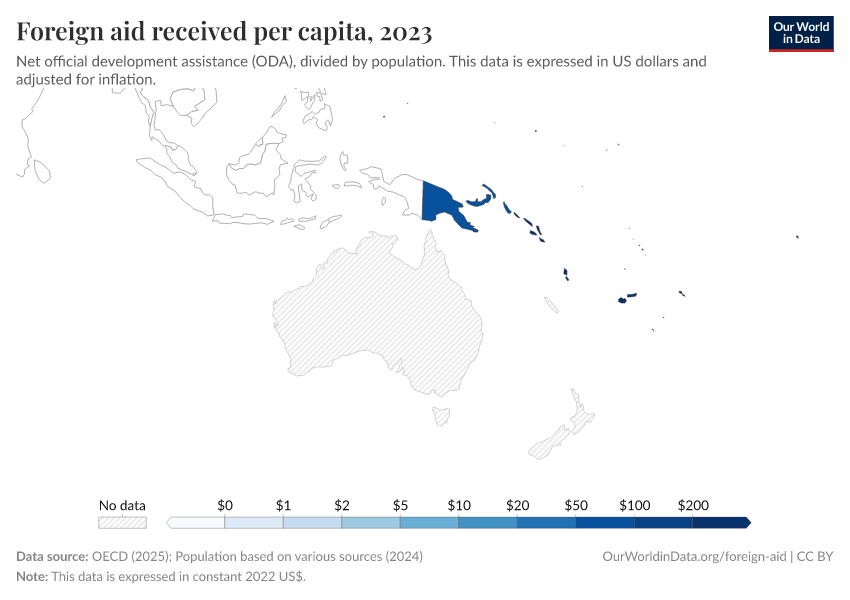 “Data Page: Foreign aid received per capita”, part of the following publication: Bastian Herre, Pablo Arriagada, Simon van Teutem, and Hannah Ritchie (2024) - “Foreign Aid”. Data adapted from OECD, Various sources. Retrieved from https://archive.ourworldindata.org/20250925-232706/grapher/foreign-aid-received-per-capita.html [online resource] (archived on September 25, 2025).How to cite this data