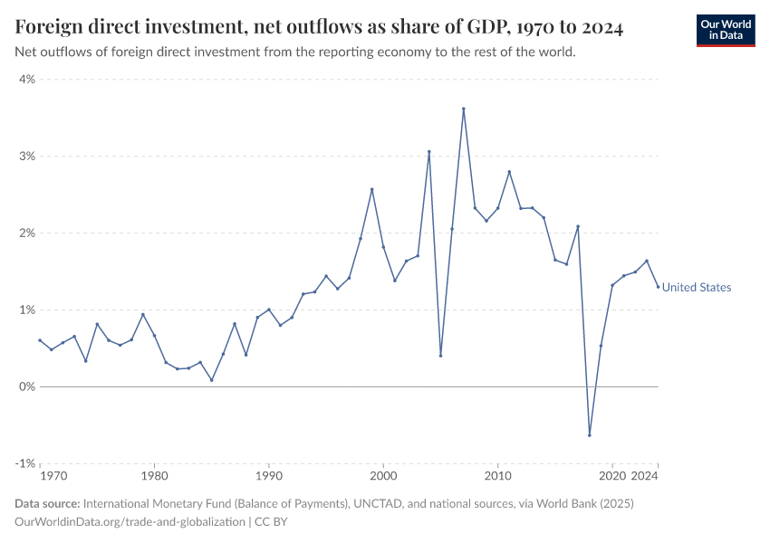 “Data Page: Foreign direct investment, net outflows as share of GDP”. Our World in Data (2025). Data adapted from International Monetary Fund (Balance of Payments), UNCTAD, and national sources, via World Bank. Retrieved from https://archive.ourworldindata.org/20250916-102301/grapher/foreign-direct-investment-net-outflows-as-share-of-gdp.html [online resource] (archived on September 16, 2025).How to cite this data