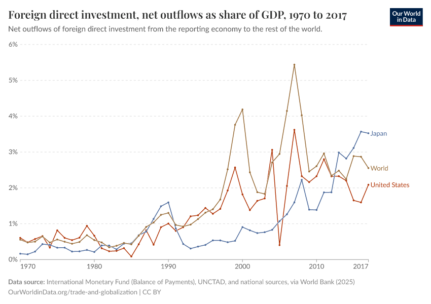 “Data Page: Foreign direct investment, net outflows as share of GDP”. Our World in Data (2025). Data adapted from International Monetary Fund (Balance of Payments), UNCTAD, and national sources, via World Bank. Retrieved from https://archive.ourworldindata.org/20250916-102301/grapher/foreign-direct-investment-net-outflows-as-share-of-gdp.html [online resource] (archived on September 16, 2025).How to cite this data