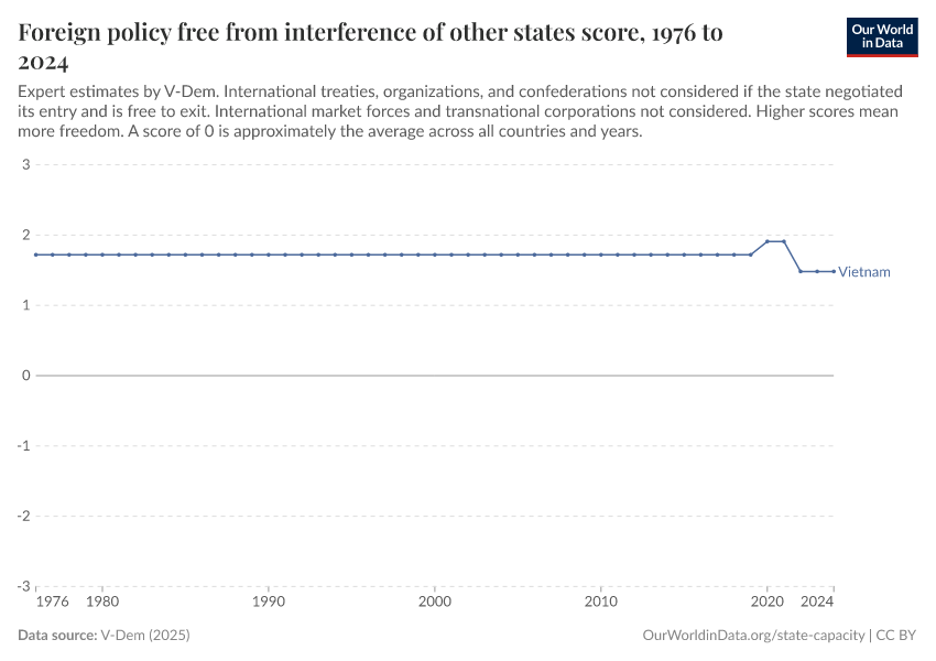 “Data Page: Foreign policymaking free from foreign influence”, part of the following publication: Bastian Herre, Lucas Rodés-Guirao, and Esteban Ortiz-Ospina (2013) - “Democracy”. Data adapted from V-Dem. Retrieved from https://archive.ourworldindata.org/20250925-233948/grapher/foreign-policy-free-from-interference-of-other-states-score.html [online resource] (archived on September 25, 2025).
