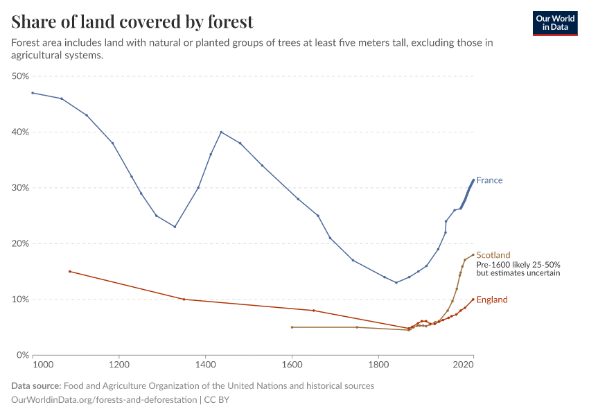 Department for Environment, Food & Rural Affairs (2013); Food and Agriculture Organization of the United Nations Regional Office for Asia and the Pacific (2009); Forest Research (2002); Mather A.S., Fairbairn J., and Needle C.J. (1999); Osamu Saito (2009); Yi-Ying Chen et al. (2019); A.S. Mather (2008); Kleinn, C., Corrales, L., & Morales, D. (2002); Soo Bae J., Won Joo, R. and Kim, Y.S. (2012); United States Department of Agriculture, Forest Service (2014); He, F., Yang, F, & Wang, Y. (2024); Scottish Government (2019); Food and Agriculture Organization of the United Nations (2024) – with major processing by Our World in Data. “Share of land covered by forest” [dataset]. Department for Environment, Food & Rural Affairs, “DEFRA - Government Forestry and Woodlands Policy Statement”; Food and Agriculture Organization of the United Nations Regional Office for Asia and the Pacific, “Vietnam Forestry Outlook Study”; Forest Research, “National inventory of woodland and trees”; Mather A.S., Fairbairn J., and Needle C.J., “The course and drivers of the forest transition: The case of France”; Osamu Saito, “Forest history and the Great Divergence: China, Japan, and the West compared”; Yi-Ying Chen et al., “Reconstructing Taiwan’s land cover changes between 1904 and 2015 from historical maps and satellite images”; A.S. Mather, “Forest transition theory and the reforesting of Scotland”; Kleinn, C., Corrales, L., & Morales, D., “Forest area in Costa Rica: A comparative study of tropical forest cover estimates over time”; Soo Bae J., Won Joo, R. and Kim, Y.S., “Forest transition in South Korea: Reality, path and drivers”; United States Department of Agriculture, Forest Service, “U.S. Forest Resource Facts and Historical Trends”; He, F., Yang, F, & Wang, Y., “Reconstructing forest and grassland cover changes in China over the past millennium”; Scottish Government, “Scotland's Forestry Strategy: 2019-2029”; Food and Agriculture Organization of the United Nations, “Land, Inputs and Sustainability: Land Use” [original data]. Retrieved December 7, 2025 from https://archive.ourworldindata.org/20250909-093708/grapher/forest-area-as-share-of-land-area.html (archived on September 9, 2025).