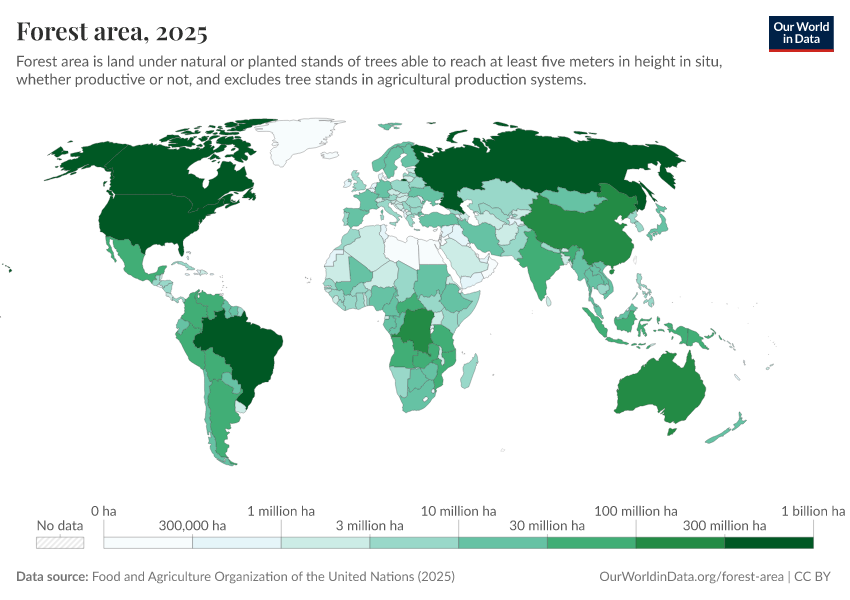 Food and Agriculture Organization of the United Nations (2025) – with major processing by Our World in Data. “Forest area” [dataset]. Food and Agriculture Organization of the United Nations, “Global Forest Resources Assessment 2025” [original data]. Retrieved March 7, 2026 from https://archive.ourworldindata.org/20260304-094028/grapher/forest-area-km.html (archived on March 4, 2026).