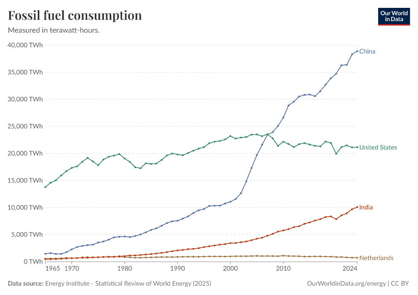 “Data Page: Primary energy consumption from fossil fuels”, part of the following publication: Hannah Ritchie, Pablo Rosado, and Max Roser (2023) - “Energy”. Data adapted from Energy Institute. Retrieved from https://archive.ourworldindata.org/20250909-093708/grapher/fossil-fuel-primary-energy.html [online resource] (archived on September 9, 2025).How to cite this data