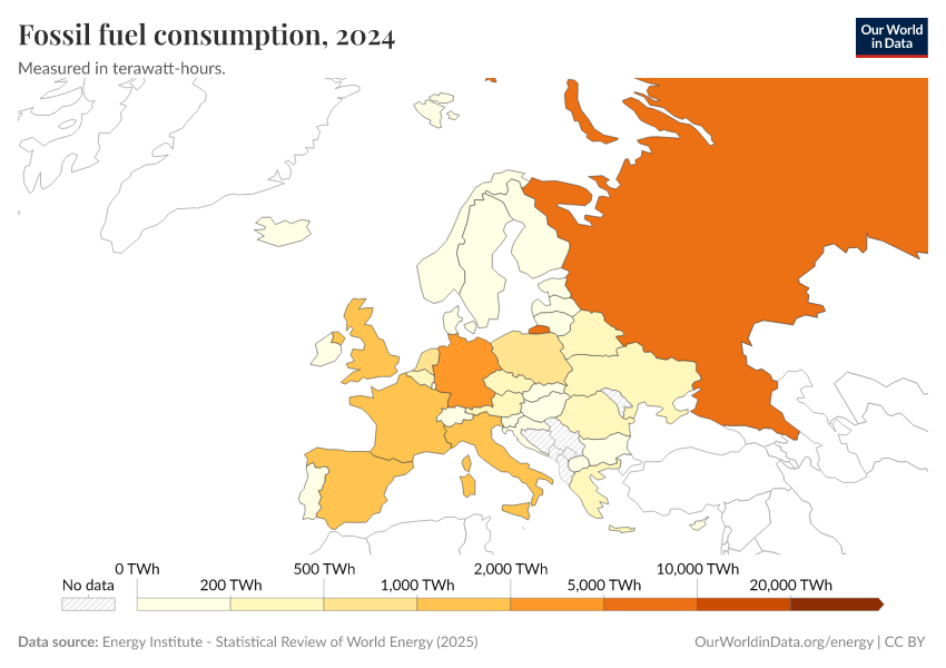 “Data Page: Primary energy consumption from fossil fuels”, part of the following publication: Hannah Ritchie, Pablo Rosado, and Max Roser (2023) - “Energy”. Data adapted from Energy Institute. Retrieved from https://archive.ourworldindata.org/20250909-093708/grapher/fossil-fuel-primary-energy.html [online resource] (archived on September 9, 2025).How to cite this data