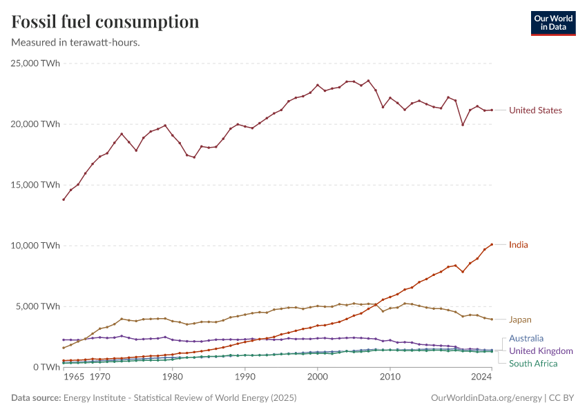 “Data Page: Primary energy consumption from fossil fuels”, part of the following publication: Hannah Ritchie, Pablo Rosado, and Max Roser (2023) - “Energy”. Data adapted from Energy Institute. Retrieved from https://archive.ourworldindata.org/20250909-093708/grapher/fossil-fuel-primary-energy.html [online resource] (archived on September 9, 2025).How to cite this data