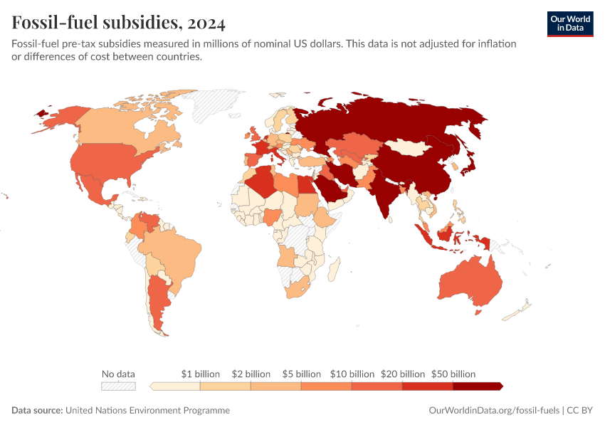 “Data Page: Fossil-fuel subsidies”. Our World in Data (2026). Data adapted from United Nations Environment Programme. Retrieved from https://archive.ourworldindata.org/20251125-165536/grapher/fossil-fuel-subsidies.html [online resource] (archived on November 25, 2025).How to cite this data