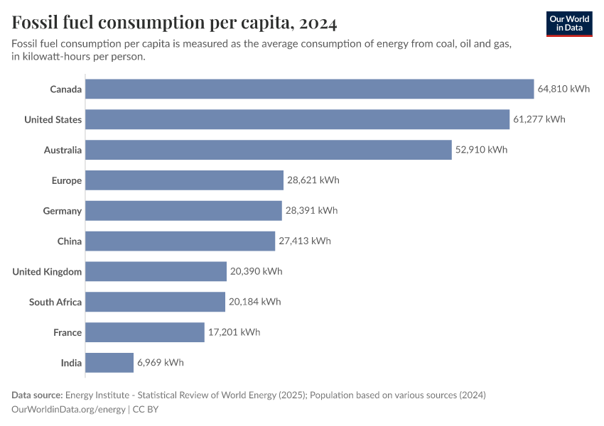 Energy Institute - Statistical Review of World Energy (2025); Population based on various sources (2024) – with major processing by Our World in Data. “Fossil fuel consumption per capita” [dataset]. Energy Institute, “Statistical Review of World Energy”; Various sources, “Population” [original data]. Retrieved January 15, 2026 from https://archive.ourworldindata.org/20251204-144539/grapher/fossil-fuels-per-capita.html (archived on December 4, 2025).