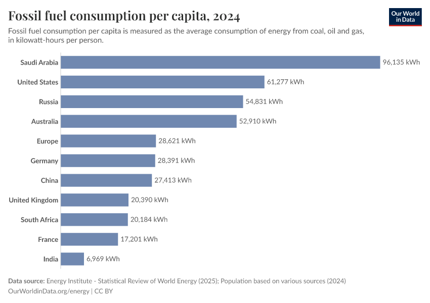 “Data Page: Fossil fuel consumption per capita”, part of the following publication: Hannah Ritchie, Pablo Rosado, and Max Roser (2023) - “Energy”. Data adapted from Energy Institute, Various sources. Retrieved from https://archive.ourworldindata.org/20251204-144539/grapher/fossil-fuels-per-capita.html [online resource] (archived on December 4, 2025).How to cite this data