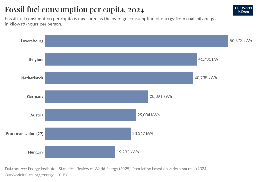 “Data Page: Fossil fuel consumption per capita”, part of the following publication: Hannah Ritchie, Pablo Rosado, and Max Roser (2023) - “Energy”. Data adapted from Energy Institute, Various sources. Retrieved from https://archive.ourworldindata.org/20251204-144539/grapher/fossil-fuels-per-capita.html [online resource] (archived on December 4, 2025).