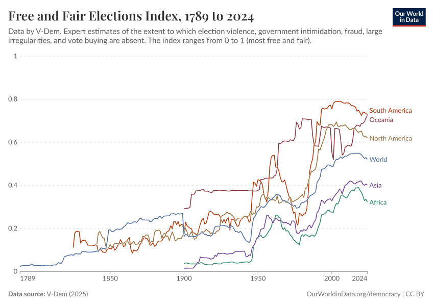 “Data Page: Free and fair elections index”, part of the following publication: Bastian Herre, Lucas Rodés-Guirao, and Esteban Ortiz-Ospina (2013) - “Democracy”. Data adapted from V-Dem. Retrieved from https://archive.ourworldindata.org/20260105-133053/grapher/free-and-fair-elections-index.html [online resource] (archived on January 5, 2026).How to cite this data