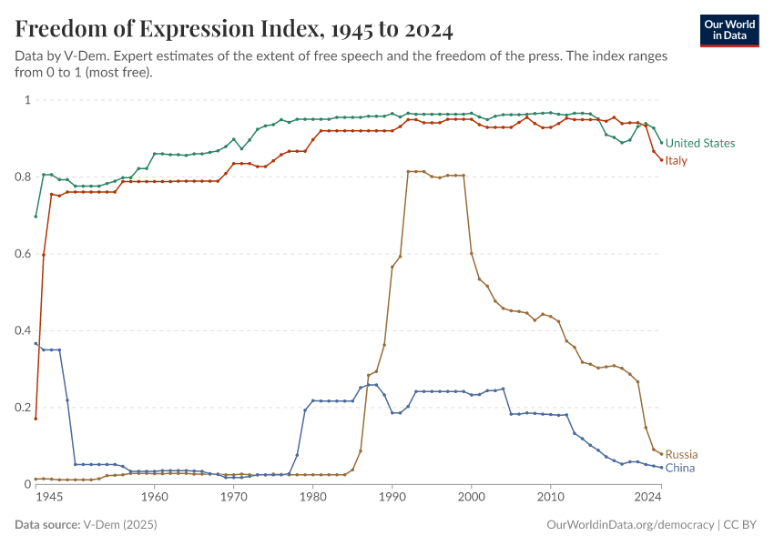 “Data Page: Freedom of expression index”, part of the following publication: Bastian Herre, Lucas Rodés-Guirao, and Esteban Ortiz-Ospina (2013) - “Democracy”. Data adapted from V-Dem. Retrieved from https://archive.ourworldindata.org/20251209-133038/grapher/freedom-of-expression-index.html [online resource] (archived on December 9, 2025).How to cite this data