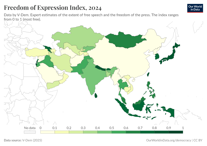 “Data Page: Freedom of expression index”, part of the following publication: Bastian Herre, Lucas Rodés-Guirao, and Esteban Ortiz-Ospina (2013) - “Democracy”. Data adapted from V-Dem. Retrieved from https://archive.ourworldindata.org/20251209-133038/grapher/freedom-of-expression-index.html [online resource] (archived on December 9, 2025).How to cite this data