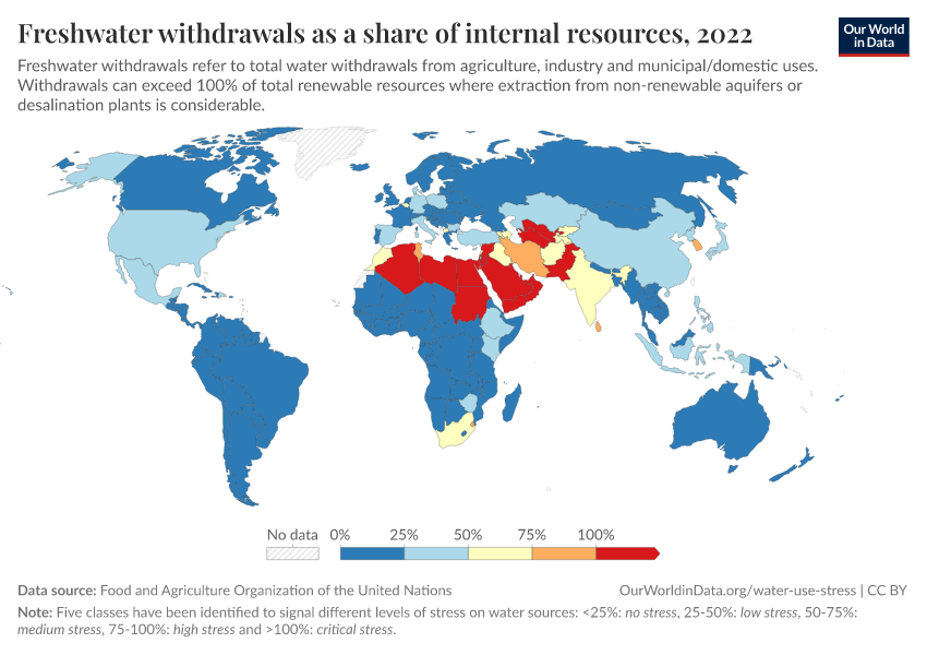 Food and Agriculture Organization of the United Nations – processed by Our World in Data. “Freshwater withdrawals as a share of internal resources” [dataset]. Food and Agriculture Organization of the United Nations, “Food and Agriculture Organisation of United Nations (FAO)” [original data]. Retrieved January 15, 2026 from https://archive.ourworldindata.org/20251125-165536/grapher/freshwater-withdrawals-as-a-share-of-internal-resources.html (archived on November 25, 2025).