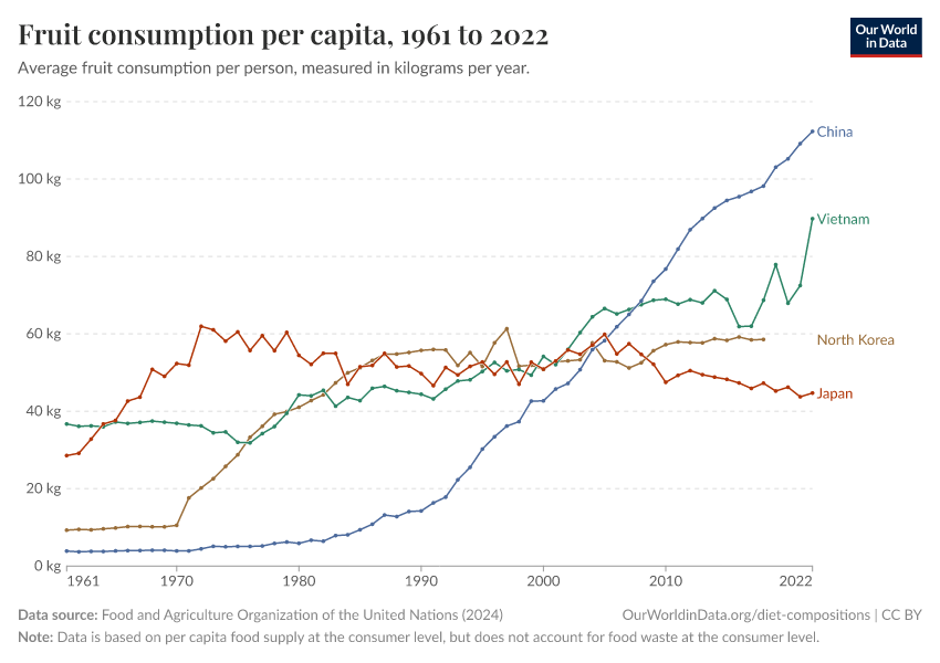 Food and Agriculture Organization of the United Nations (2024) – processed by Our World in Data. “Yearly per capita supply of fruit” [dataset]. Food and Agriculture Organization of the United Nations, “Food Balances: Food Balances (-2013, old methodology and population)”; Food and Agriculture Organization of the United Nations, “Food Balances: Food Balances (2010-)” [original data]. Retrieved December 8, 2025 from https://archive.ourworldindata.org/20251128-120039/grapher/fruit-consumption-per-capita.html (archived on November 28, 2025).