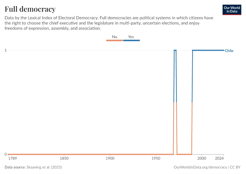 “Data Page: Full democracy”, part of the following publication: Bastian Herre, Lucas Rodés-Guirao, and Esteban Ortiz-Ospina (2013) - “Democracy”. Data adapted from Skaaning et al.. Retrieved from https://archive.ourworldindata.org/20250909-093708/grapher/full-democracy-lexical.html [online resource] (archived on September 9, 2025).How to cite this data
