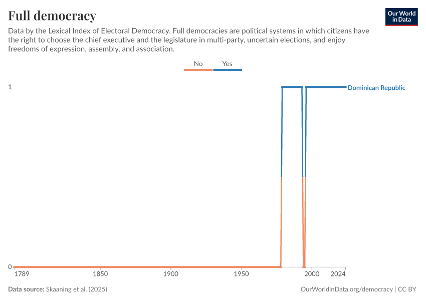 “Data Page: Full democracy”, part of the following publication: Bastian Herre, Lucas Rodés-Guirao, and Esteban Ortiz-Ospina (2013) - “Democracy”. Data adapted from Skaaning et al.. Retrieved from https://archive.ourworldindata.org/20260119-065148/grapher/full-democracy-lexical.html [online resource] (archived on January 19, 2026).How to cite this data